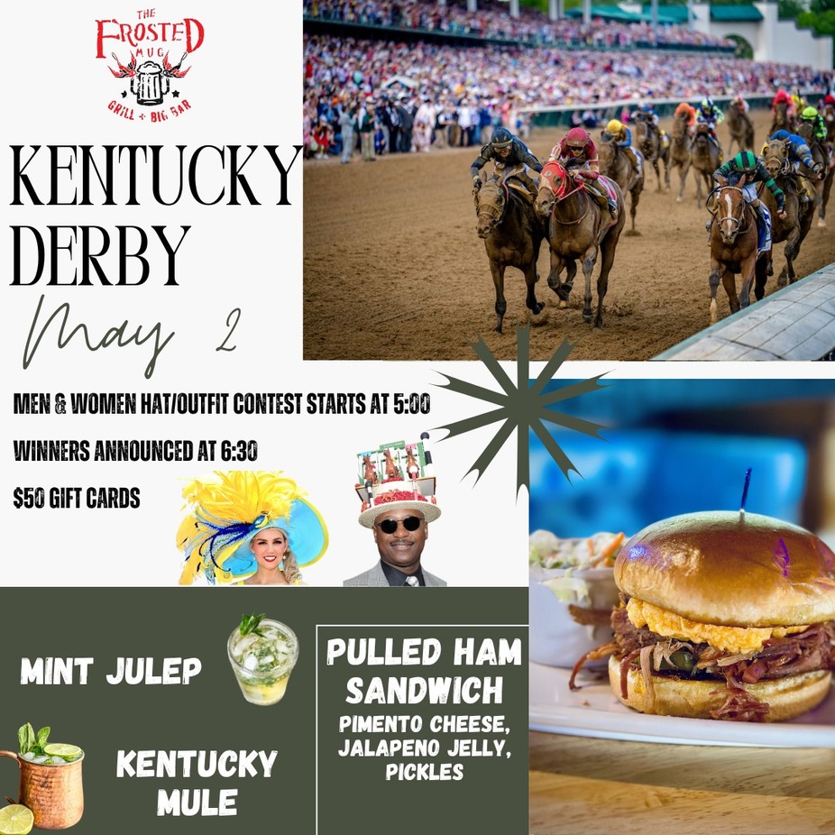 Saturday, May 2. Races on all day. Hat/Outfit contest starts at 5:00. Winners announced at 6:30- $50 gift cards. Drink specials- Mint Julep $8, Kentucky Mule $8. Food special- Pulled ham sandwich topped with pimento cheese, jalapeno jelly, and pickles $15