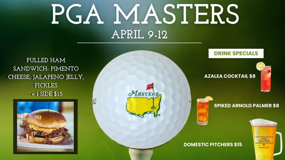 PGA Masters at The Frosted Mug, April 9-12. Pulled Ham Sandwich, pimento cheese, jalapeno jelly, pickles $15. Domestic Pitchers $15, Azalea Cocktail $8. Spiked Arnold Palmer $8